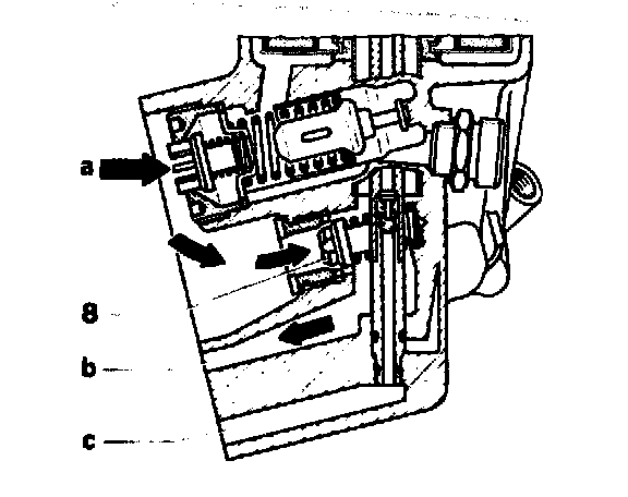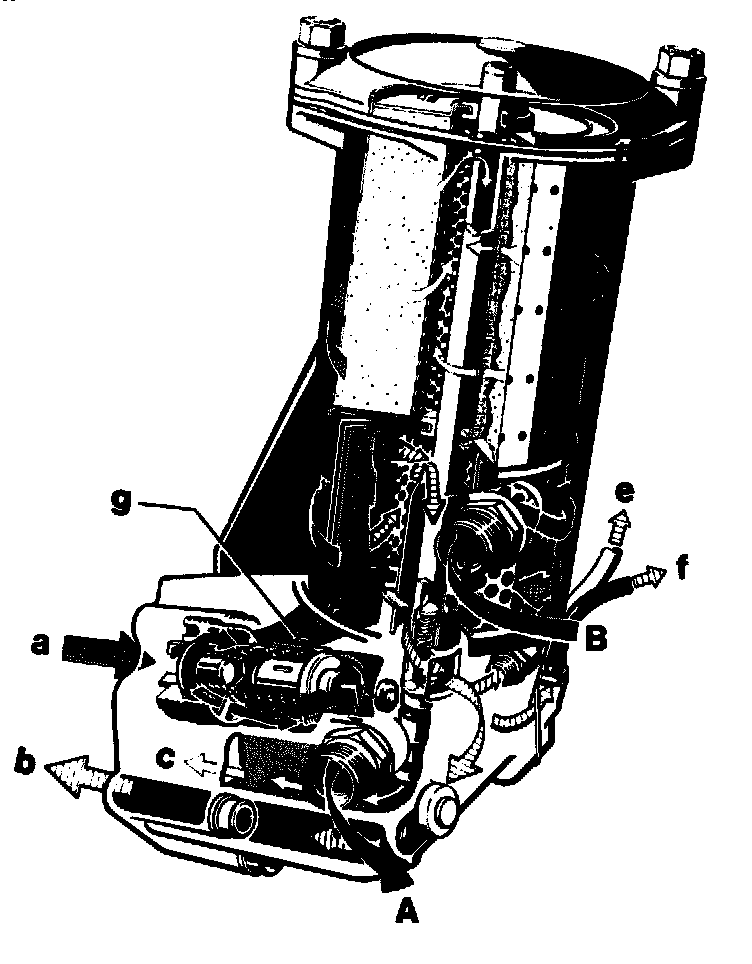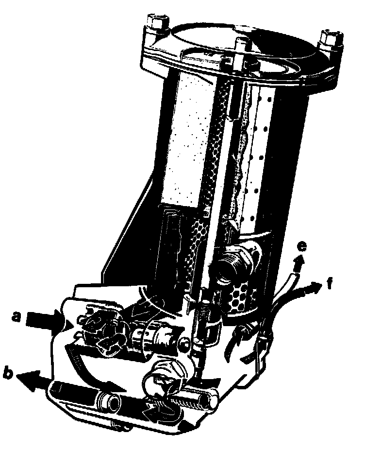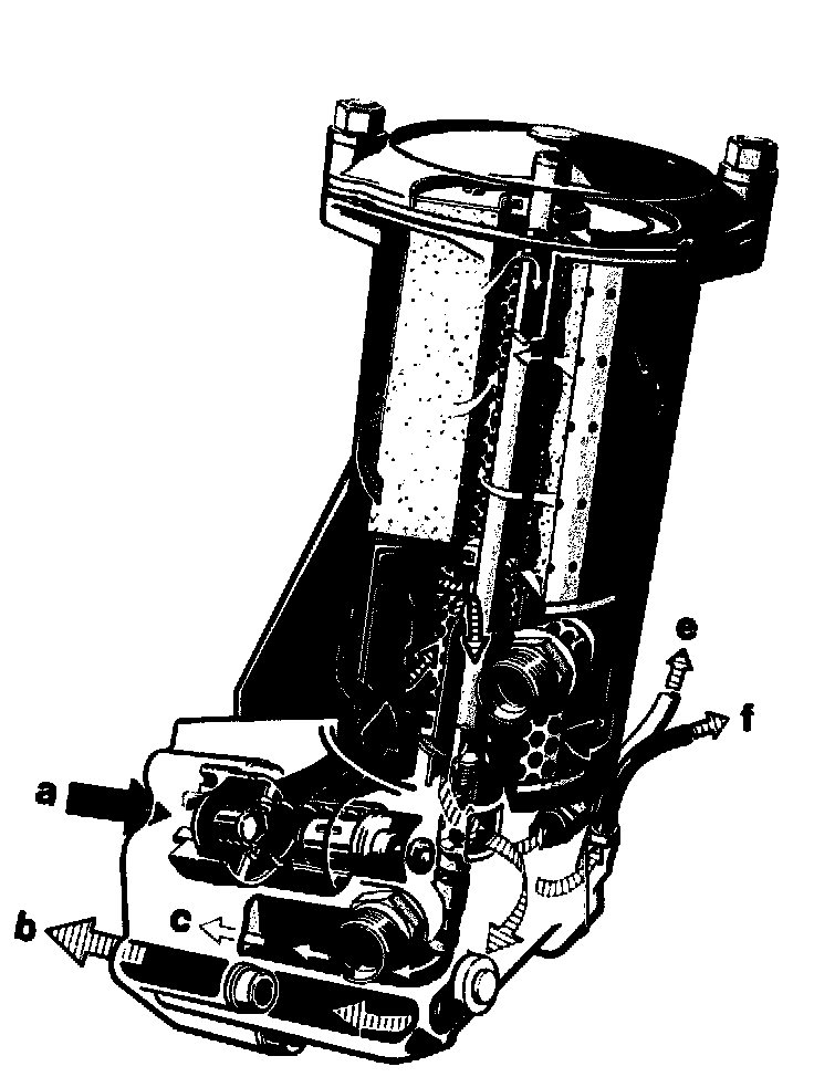 Coming from oil pump via feed duct (a). the oil enters the oil filter housing at return flow locking valve (16) and flows directly to combination filter element up to an oil temperature of approx. 110 °C.