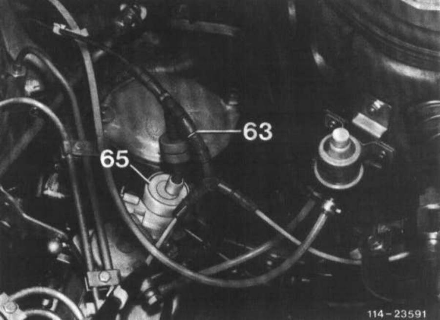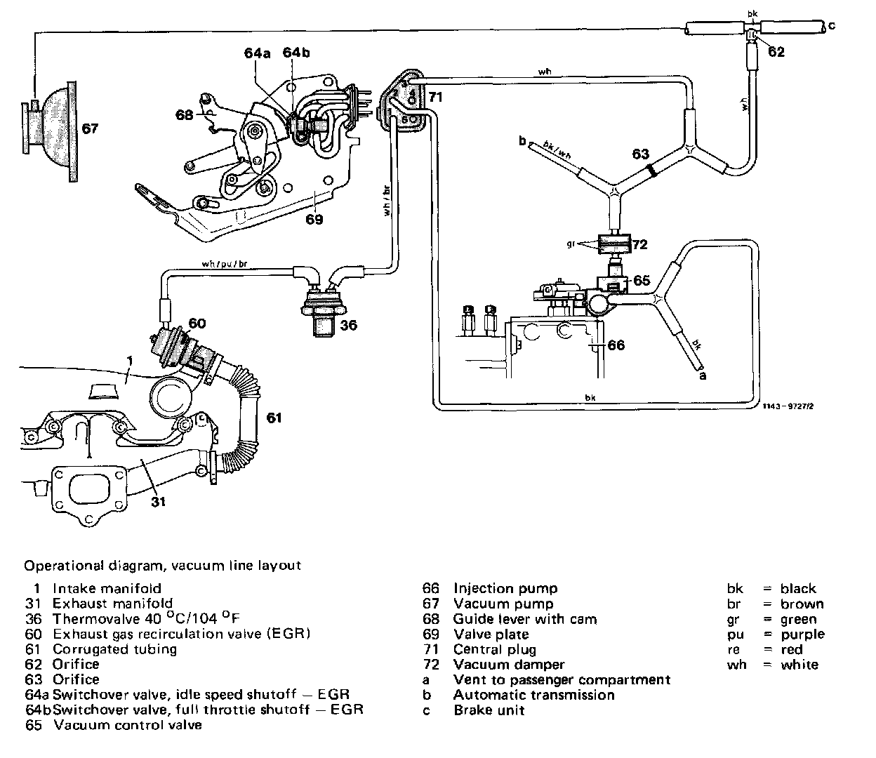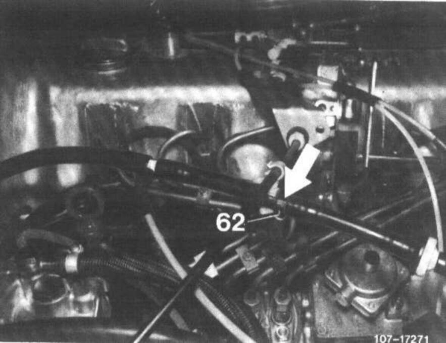 Check all vacuum lines for control of EGR and automatic transmission according to operating diagram vacuum line layout for correct connection and leaks. Blow through orifice (62) in vacuum tapping point, if required.