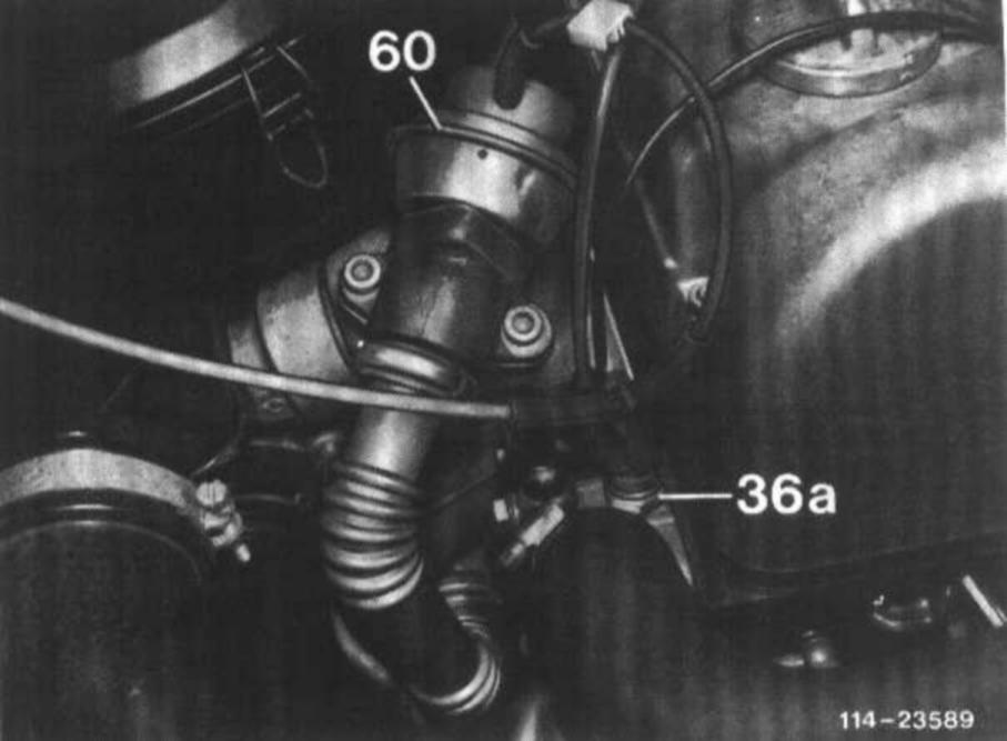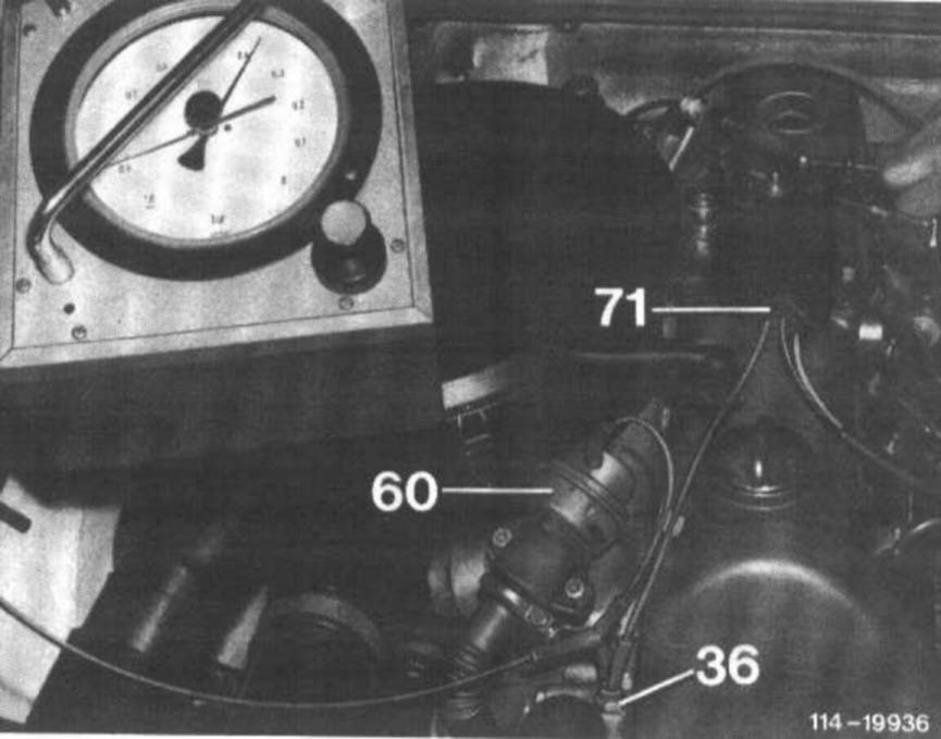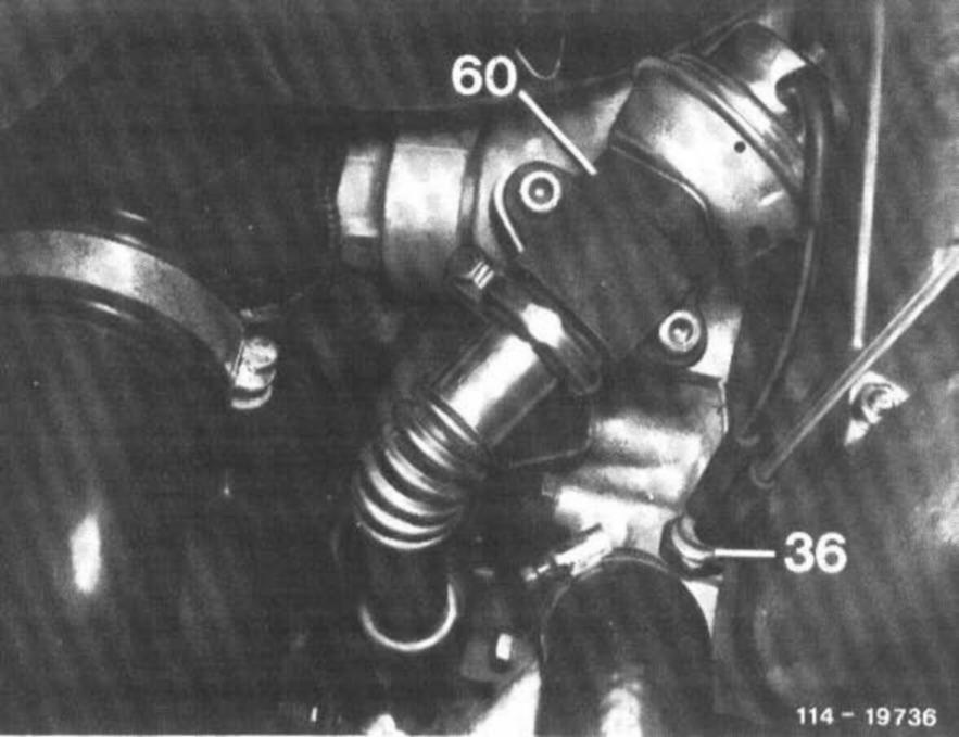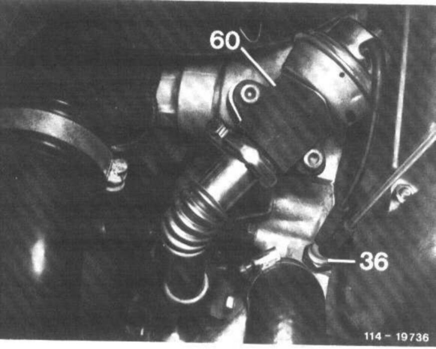 Connect vacuum tester between EGR valve (60) and straight connection of thermovalve (36). At idle, with throttle linkage at idle stop, no vacuum should be indicated. Advance control linkage until free travel of free travel rod is eliminated (do not pull on stop lever). The vacuum should now amount to 350-500 mbar.