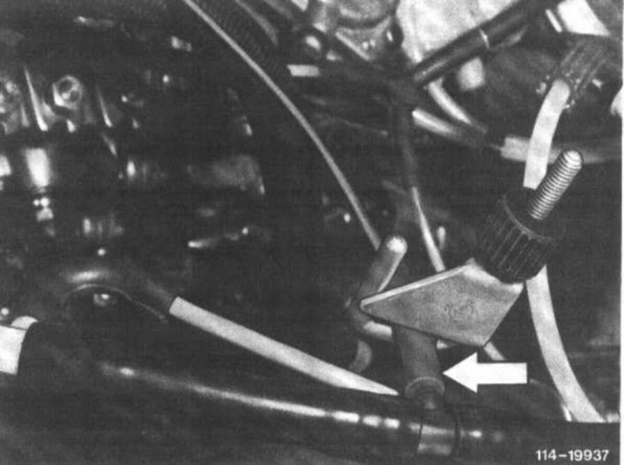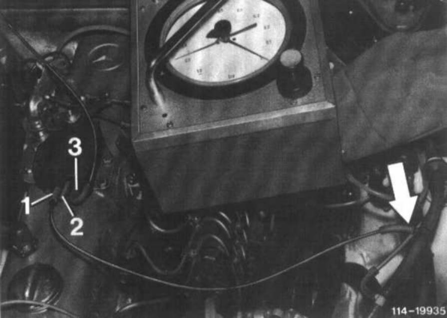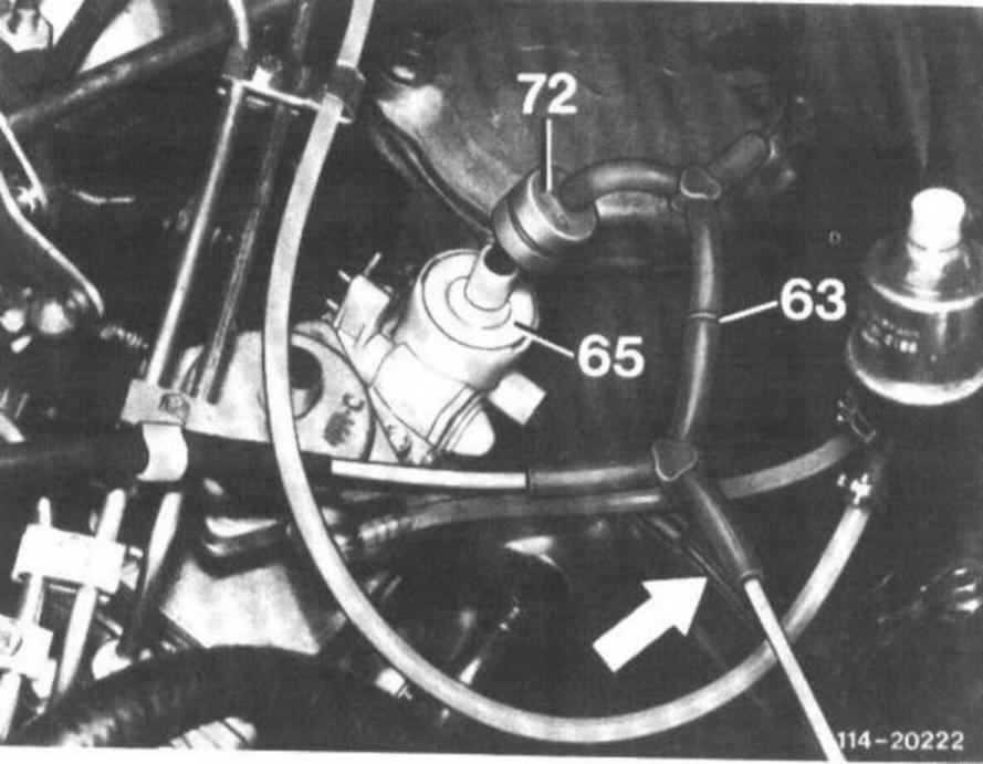 Check black vent line (arrow) from vacuum control valve to passenger compartment for free passage.