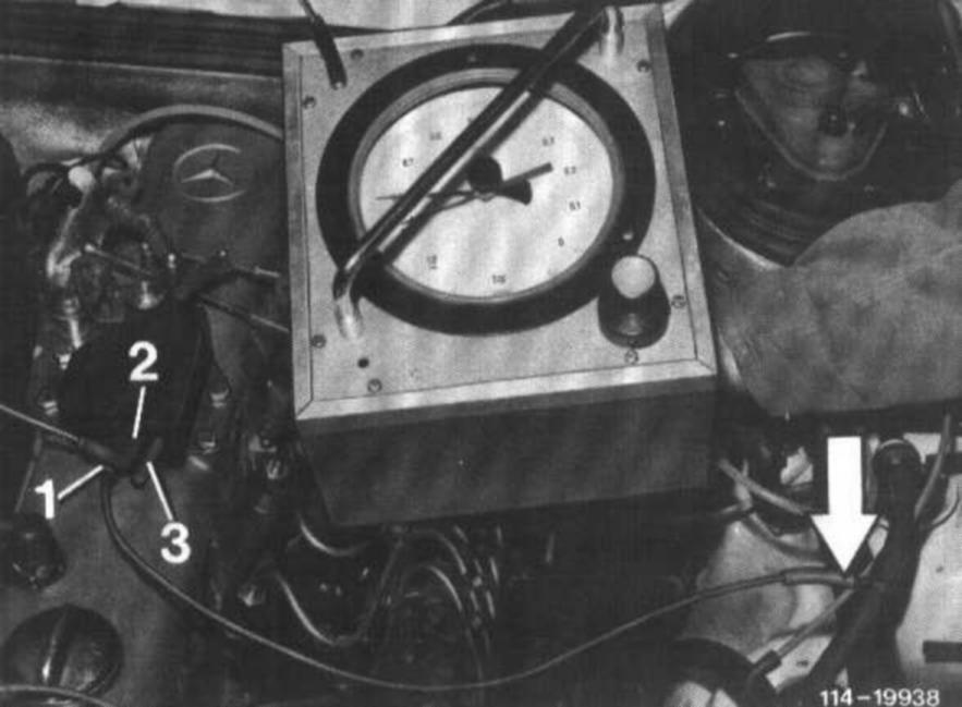 Pull central plug (71) from valve plate (69). Connect test line between tapping point (black orifice, arrow) on vacuum line for brake unit and valve plate connection (1). Connect vacuum tester to connection (3). Close connection (2).