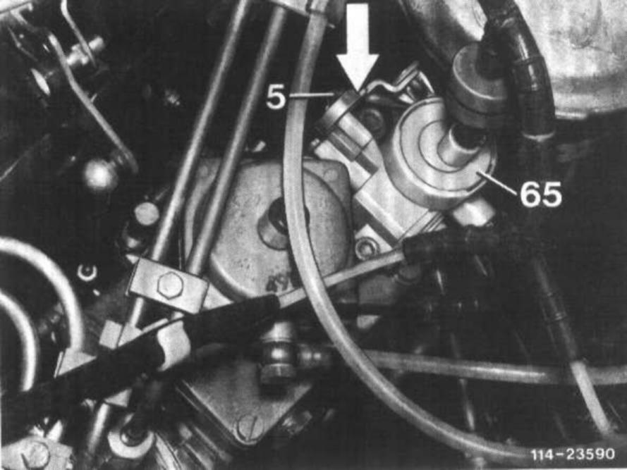 Connect vacuum tester between EGR-valve (60) and straight connection of thermovalve (36a). Disconnect connecting rod (5) on ball head. Start engine, increase rpm to approx. 900/min. Place adjusting roller on vacuum control valve (65) and set lever against stop (arrow).