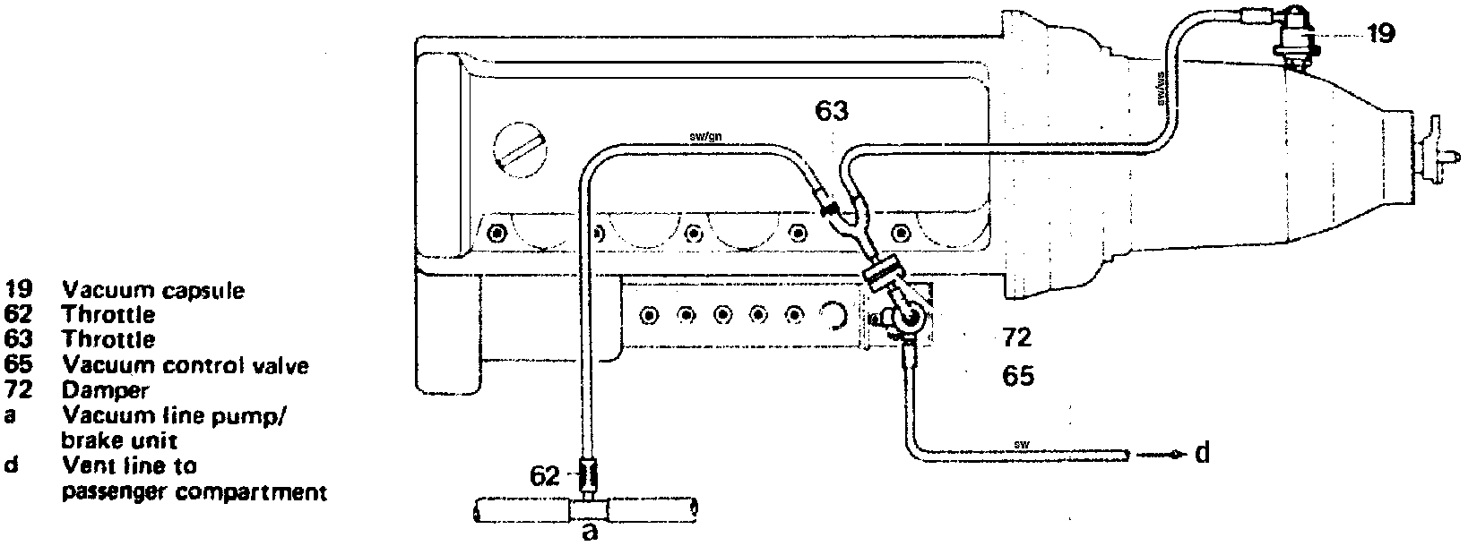 The vacuum is picked up at vacuum line (a) pump/brake unit. It is fed to the vacuum control valve (65) through the black/green vacuum line and throttle (63). The vacuum control valve controls the vacuum in idle throttle position to approx. 0.35 bar.