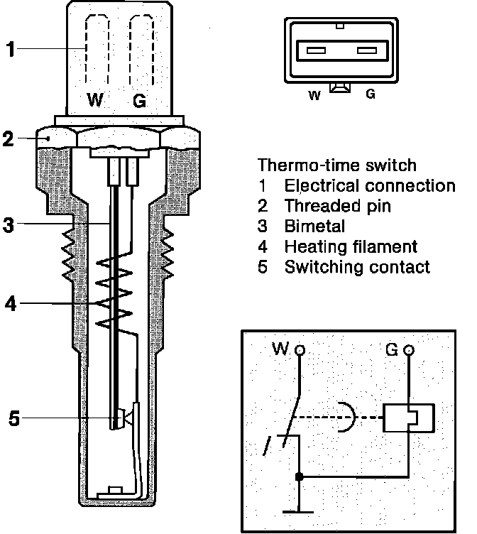 When the engine coolant is below the switch calibration temperature, the thermo time switch, Fig. 9, is closed completing the cold start valve ground circuit. During cranking battery voltage is applied to both the cold start valve and timing switch, and the start valve injects fuel into the manifold. After 3 - 10 seconds, voltage applied to the thermo time switch heats an internal element which expands opening the cold start valve ground circuit and the cold start valve is de-energized. When coolant temperature exceeds the switch calibration temperature, the switch remains open and the cold start valve does not operate.