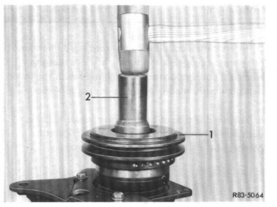 6 Knock pulley (1) with the assistance of punch (2) onto guide journal of refrigerant compressor. Position punch in such a manner that the impact force is guided against inner bearing race and the bearing itself is not damaged.