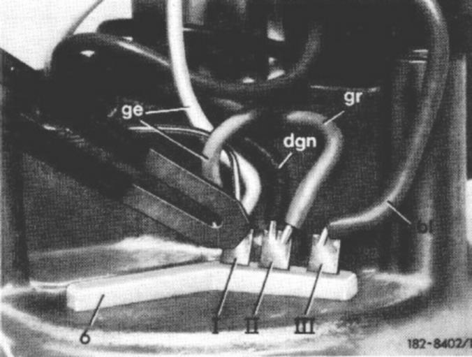 9 Solder yellow, grey and blue lines of impulse switch to soldering lugs. Make sure that the ground connecting wire is additionally soldered to soldering lug I and the dark green line additionally to soldering lug II.