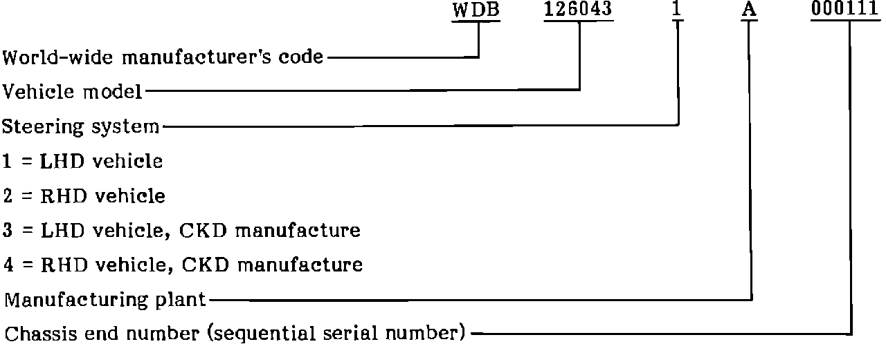 In addition, there is now only one series of chassis end numbers (the last 6 digits - sequential serial number) applicable for every model (for example, 123.133/153/193) within a particular body style (Wl23). It is also possible to have vehicles of the same model with identical chassis end numbers, differentiated only by the manufacturing plant letter.