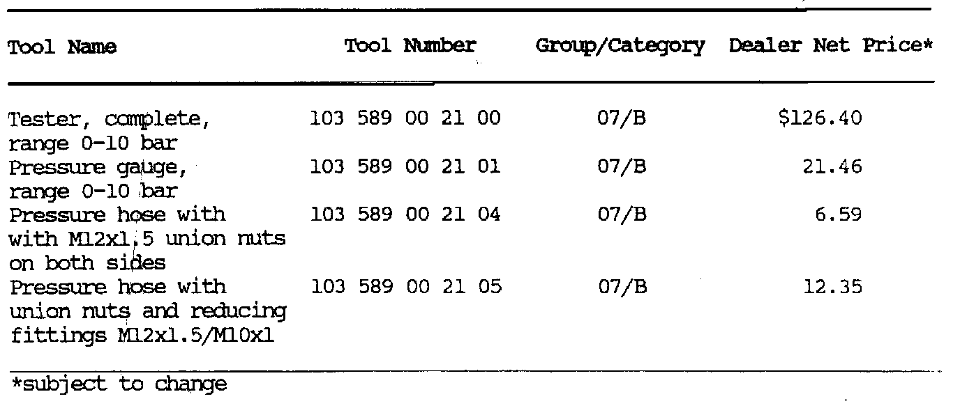 A new 0-10 bar gauge pressure tester is needed for CIS-E fuel injection system pressure checks of 6.2 to 6.4 bar in 116 and 117 engines. This tester is suitable for all engines equipped with CIS or CIS-E fuel injection Systems.