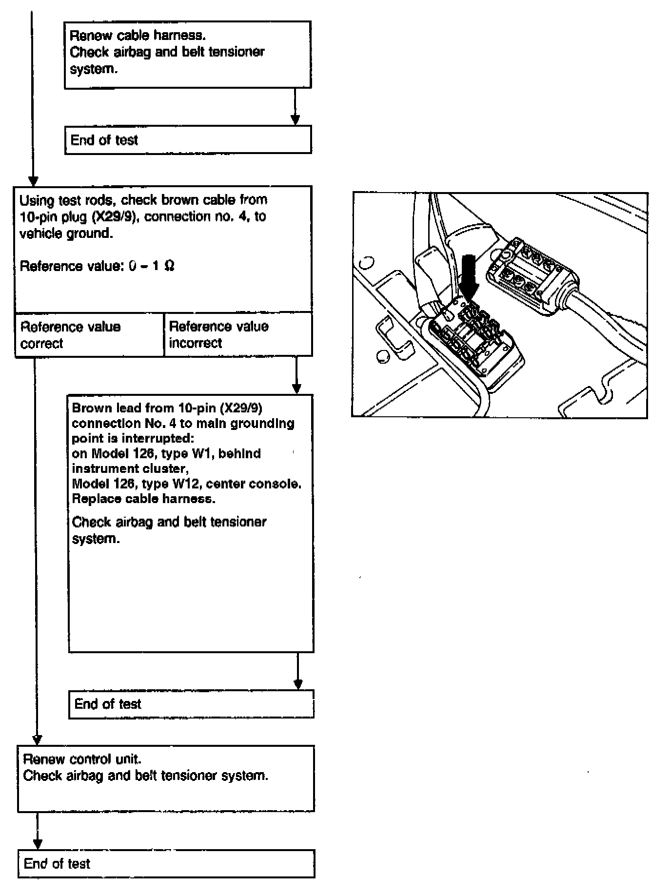 WARNING: Each time before disconnecting the red test coupling/plug connection for airbag, 10-pin (X29/9), to connect the tester, the ignition key must be turned to position "0", the negative terminal of the battery disconnected and covered. Then reconnect the battery for the test.