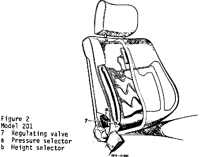 The backrest contains six air cushions (5 cushions with leather seats, Figure 3), which are inflated individually (maximum 200 mbar) from the supply pump of the central locking system.. The desired cushion firmness and position in the backrest can be adjusted with the pressure and height selector (a and b, Figures 1 & 2) on the regulating valve. This setting will stay constant until the ignition is switched off, and is re-established after it is switched on again.