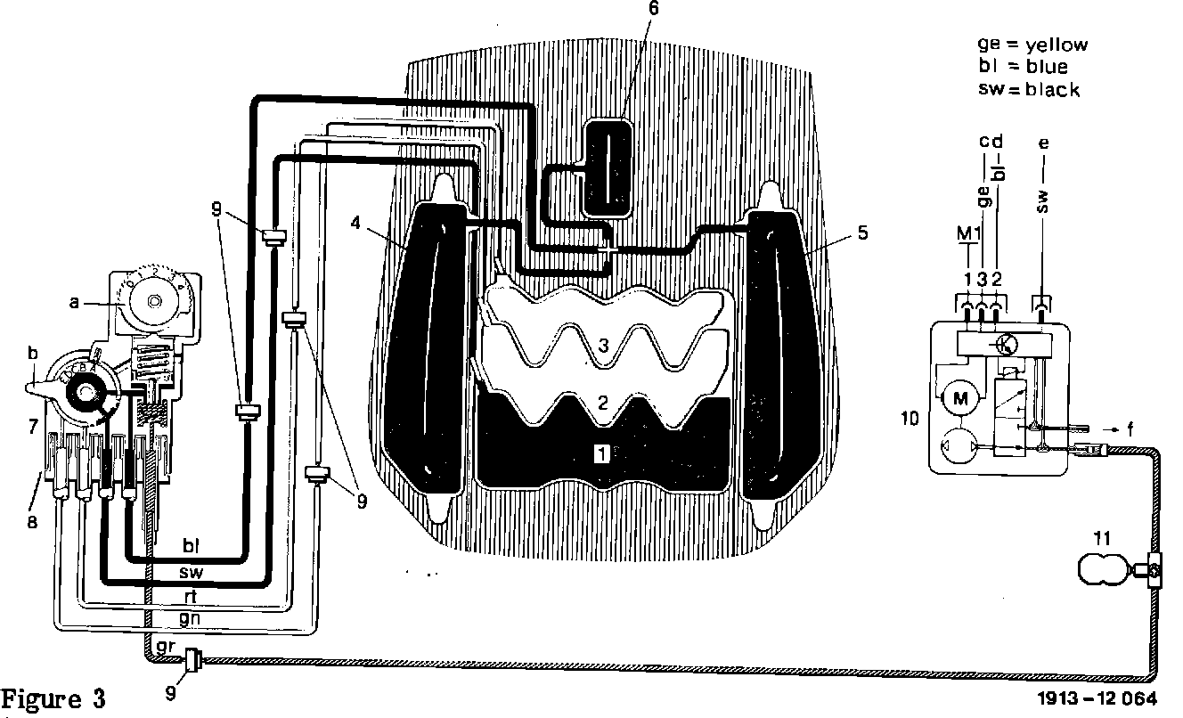 After the ignition is switched on the pump delivers up to approximately 500 mbar to the reservoir (11, Figure 4 & 5) and' through the regulating valve up to approximately 200 mbar (7, Figure 3) to the air cushions.