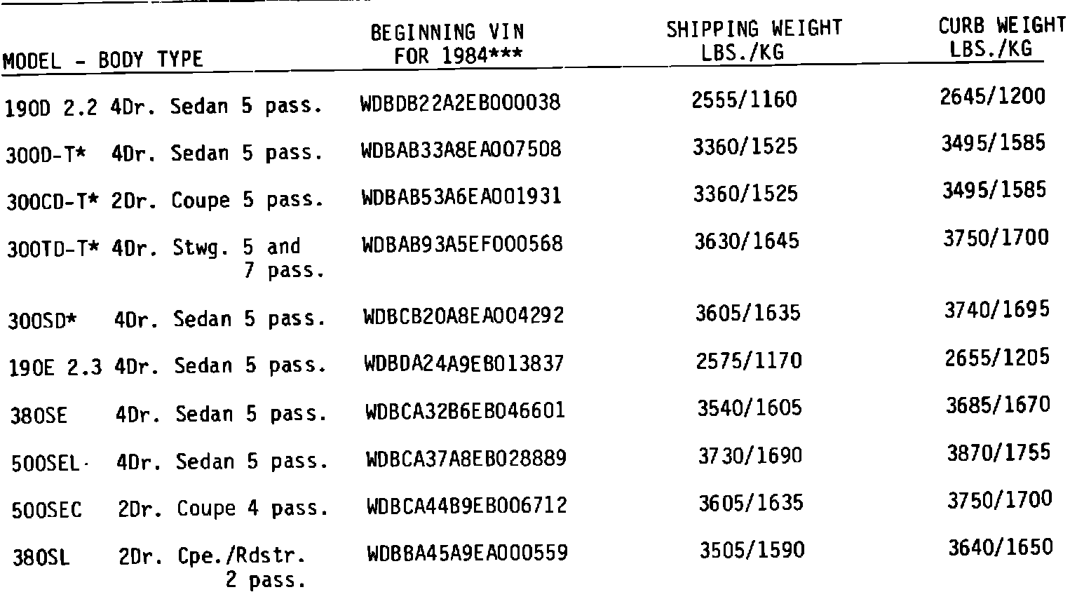 There are no annual model changes or annual model designations on Mercedes-Benz cars. For registration purposes only, effective September 19, 1983 until further notice, all new and unused MercedesBenz cars of those models listed in this letter commencing with the serial numbers indicated, when first sold carry the "Registration Year" designation of "1984". Such designation has no significance of any kind with regard to mechanical specifications, trim or equipment of Mercedes-Benz cars.