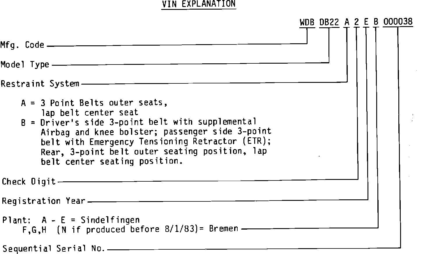 As of August 1, 1983 production, there was a change in the U.S. VIN structure for Mercedes-Benz passenger cars. The 11th digit, which is the assembly plant location code, will now be significant for vehicle identification.