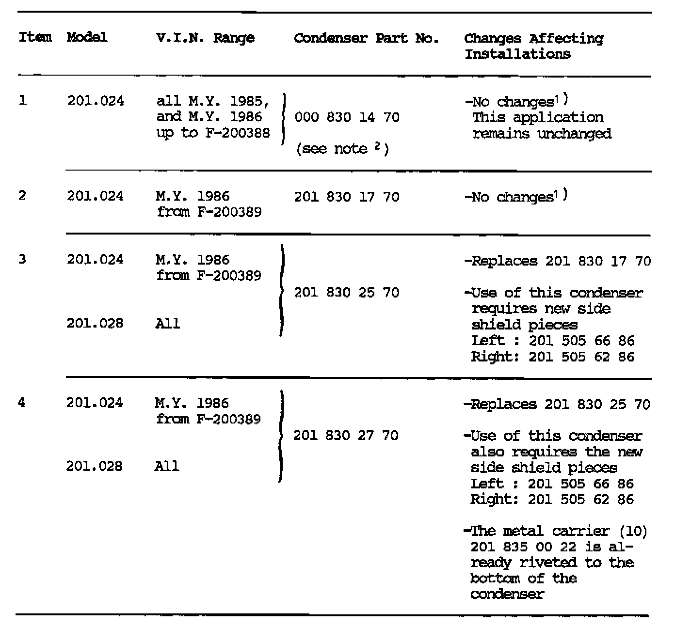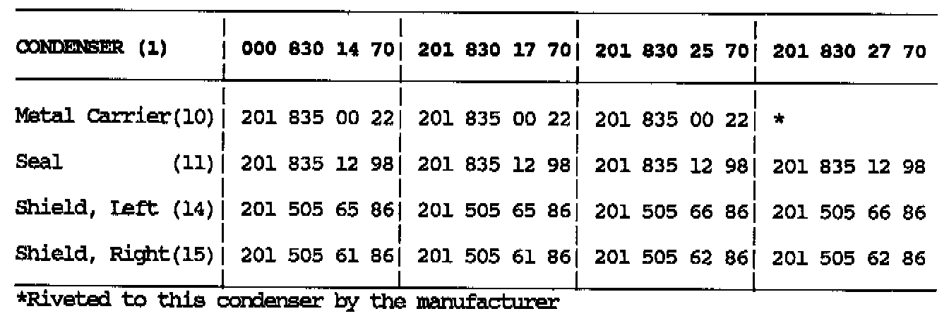 2) If this condenser (part number 000 830 14 70) is not available, the condensers mentioned in the table as items 2, 3 & 4 can be physically modified and used in its place. See special modification Work Instructions.