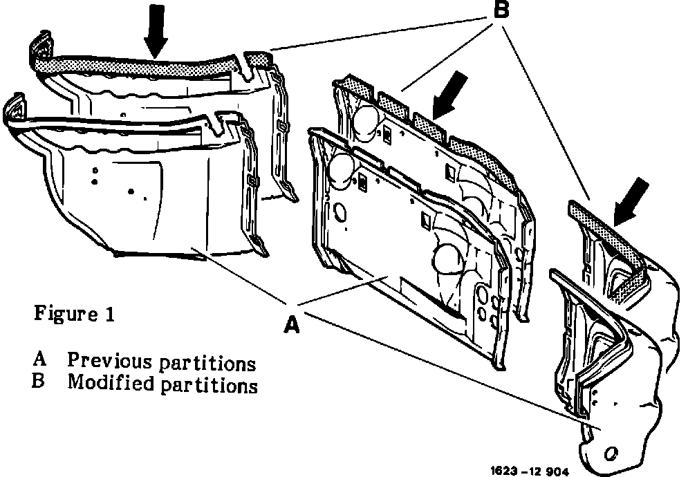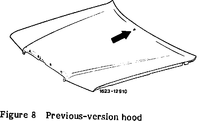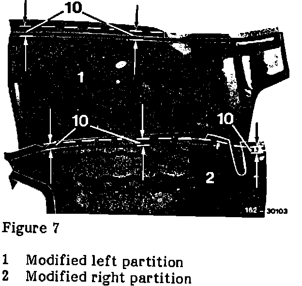 3. If a left or right front wheelhousing assembly is replaced (job no. 62-120), the modified partitions must be cut along the dashed line shown in Figure 7. During this repair, only install the previous-version hood (Figure 8).