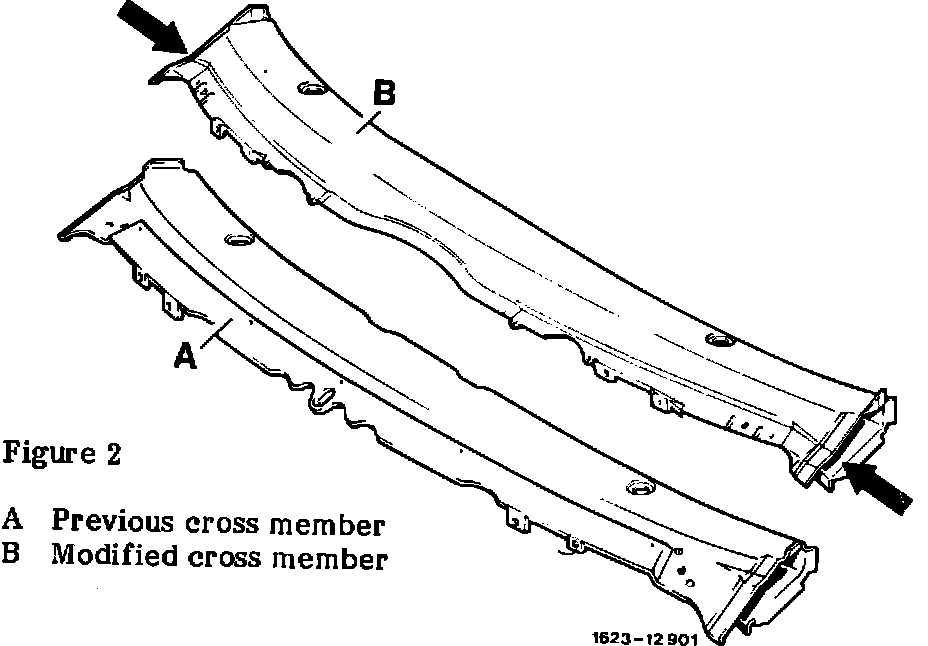To accommodate the wiper system and the modified windshield, the cross member has been reshaped across the entire installed width. The locating shoulders of the weld flanges (arrows) for welding the cross member to the front wall pillars are also different (Figure 2).
