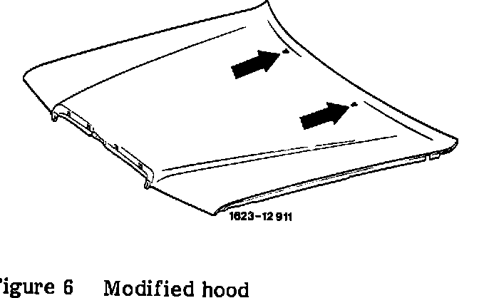 1. If the modified front body section with firewall is welded into the vehicle (job no. 62-100), the shoulders in the welding flanges of the front wall pillars must be adapted to the windshield lower cross member (dashed line, Figure 5). During this repair, only install the modified hood (two washer nozzles, arrows, Figure 6).