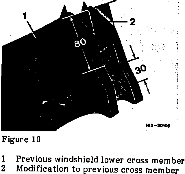 1 - Previous Windshield Lower Cross Member 2 - Modification to Previous Cross Member: