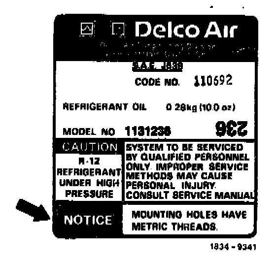 NOTE: In January 1980, the threads on the Delco A6 A/C compressor (previous designation: Frigidaire) were changed from inches to metric. These compressors are identified by a plate with the information: NOTICE: MOUNTING HOLES HAVE METRIC THREADS (see illustration, arrow). Background, borders and lines between boxes on this plate are blue.