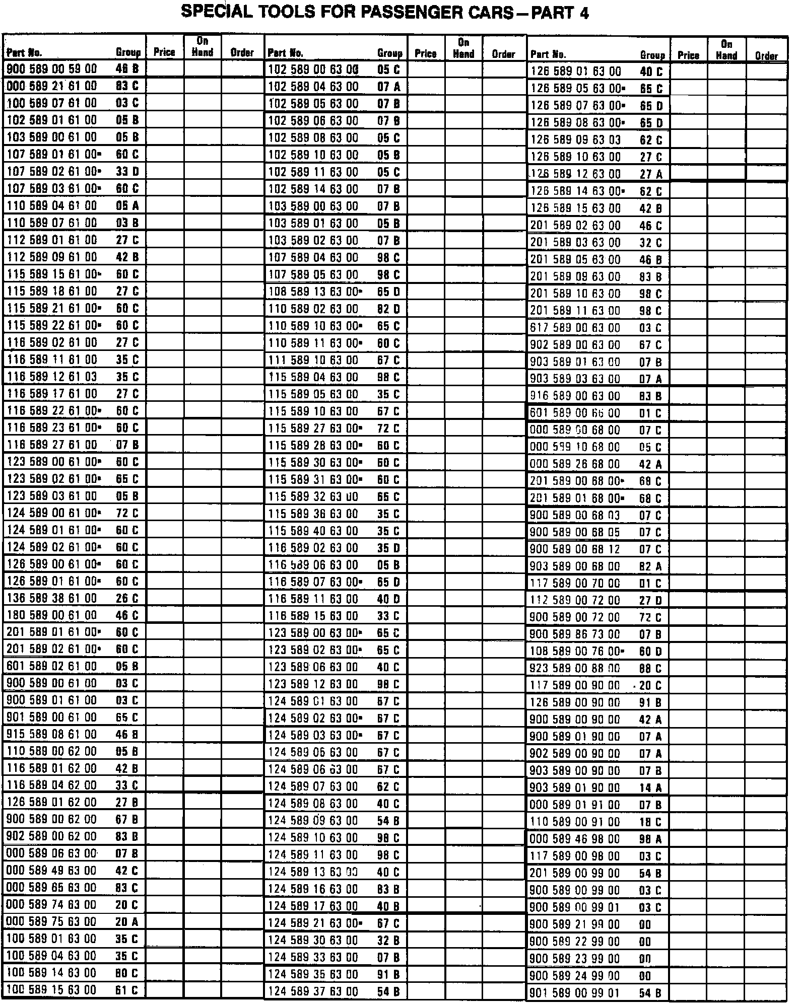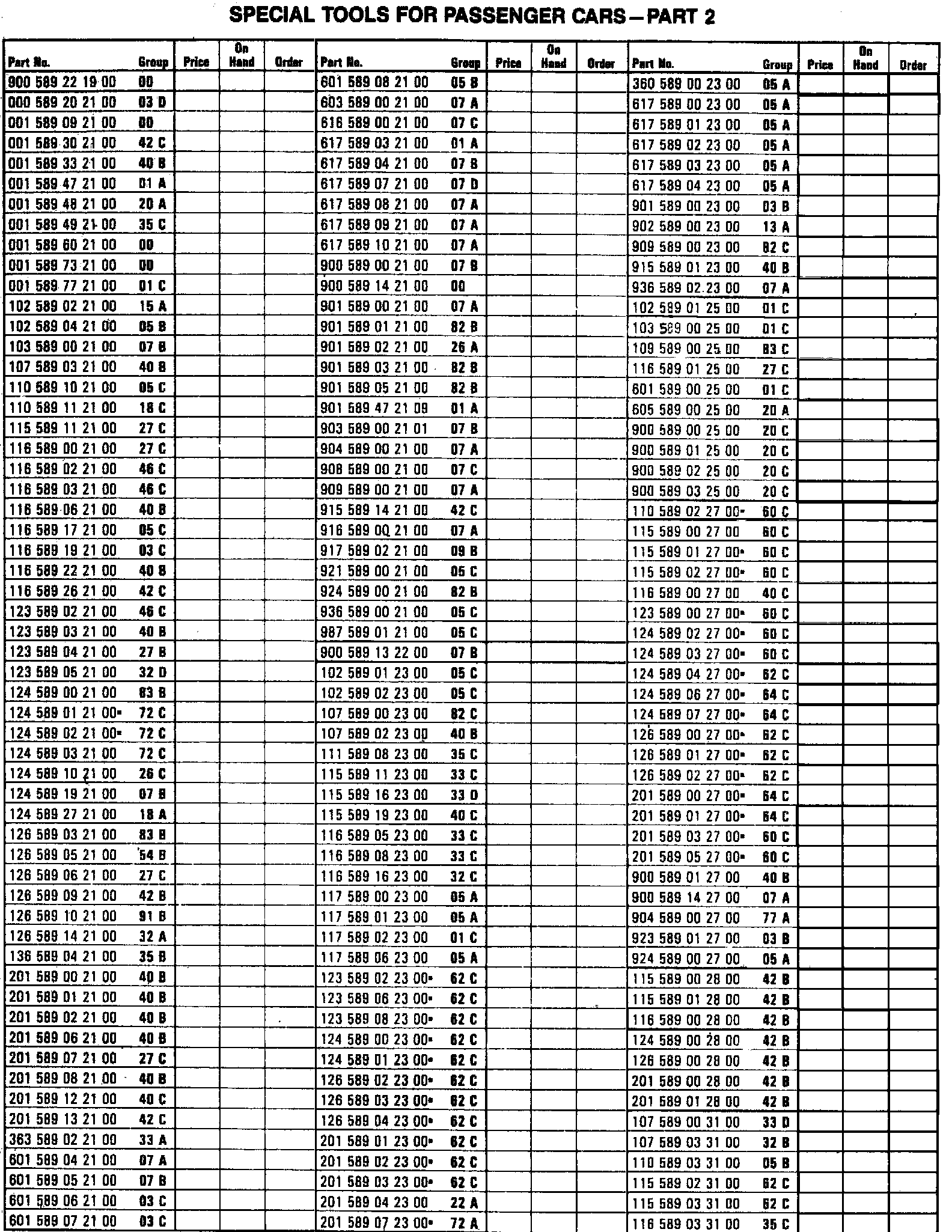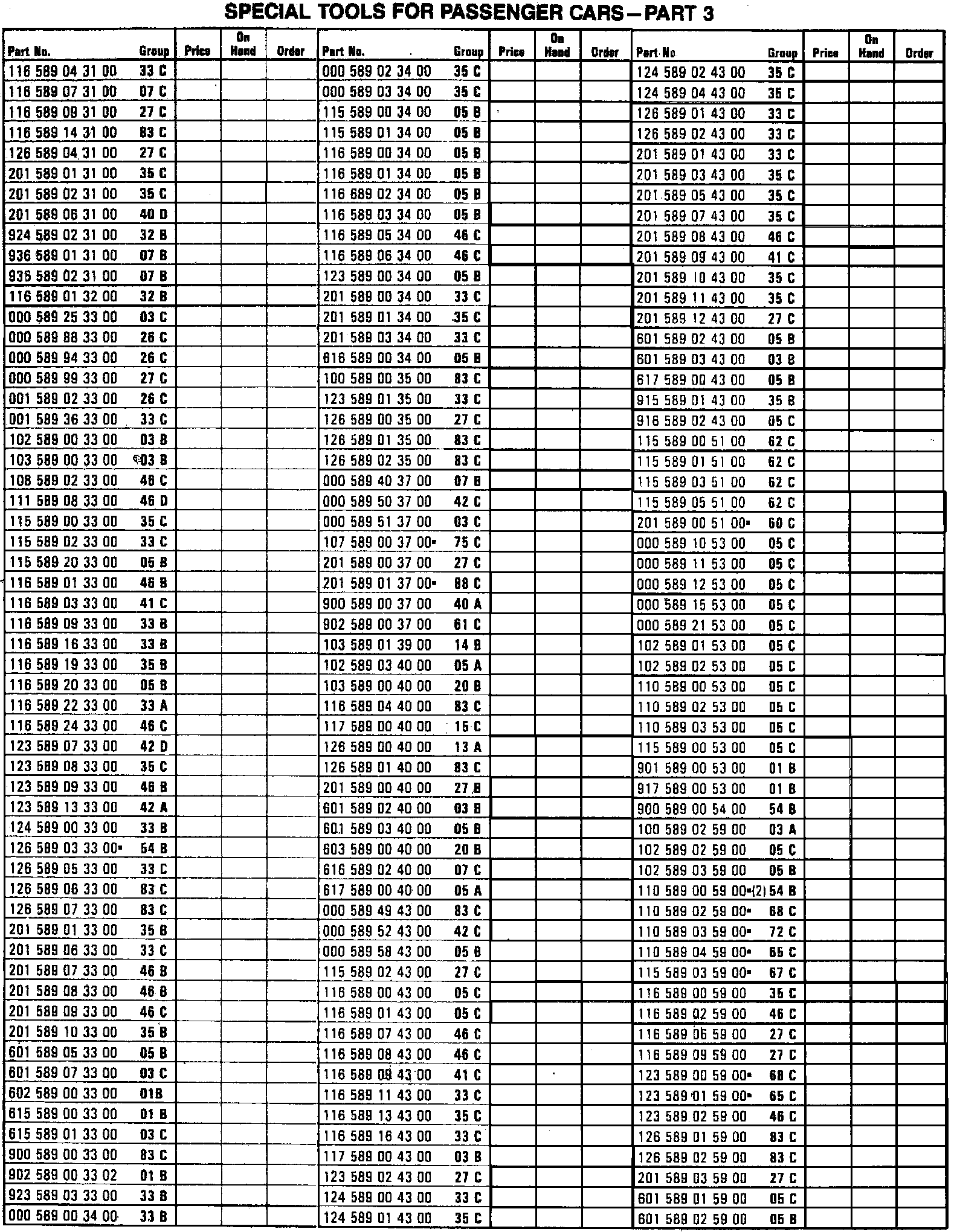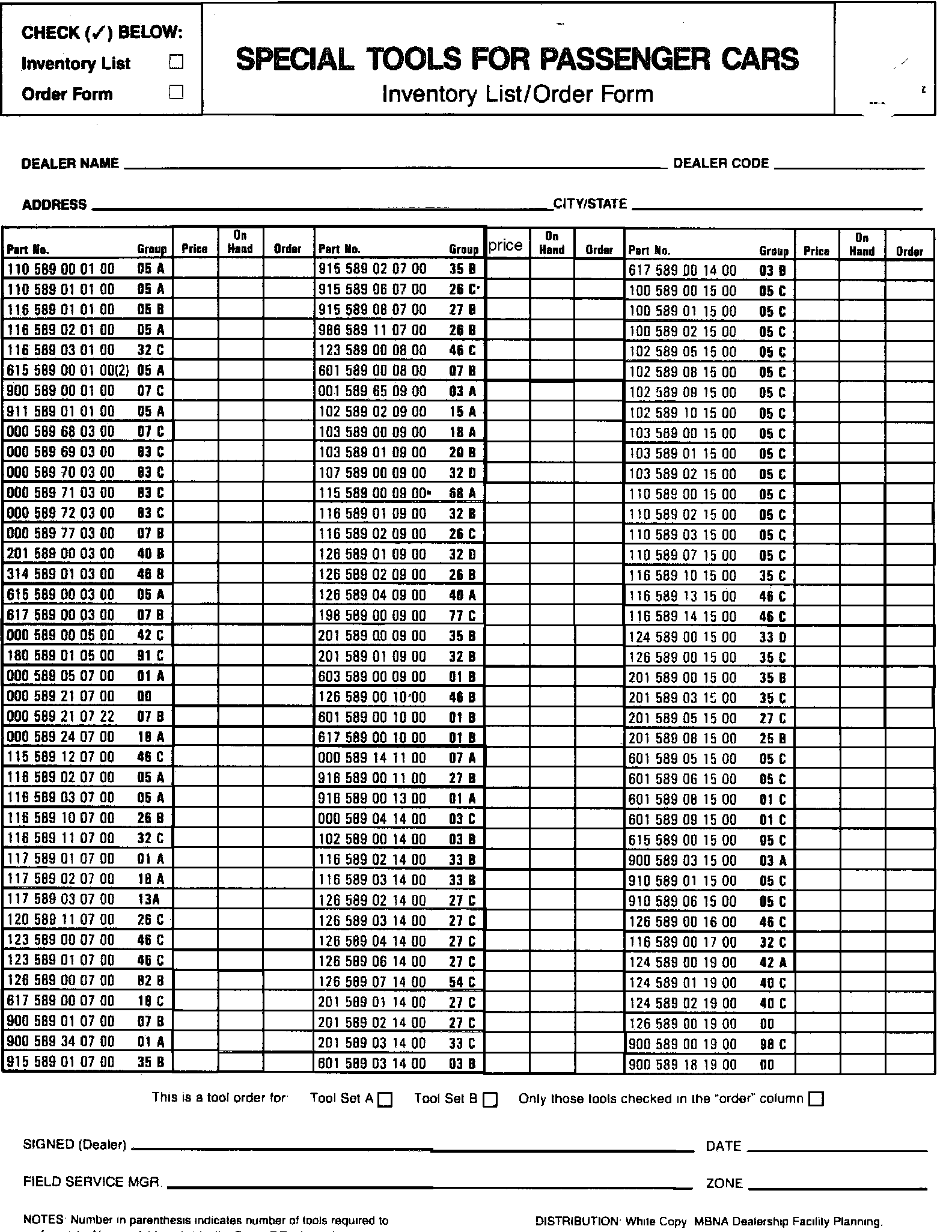 Shown is a sample copy of the Special Tool (Passenger Cars) Inventory List/Order Form updated to include all current special tools required for the service and repair of Mercedes-Benz passenger cars (Field Service Managers are receiving ten (10) copies with this bulletin). The Inventory List/Order Form must be completed when preparing a Service Assessment for a prospective dealer, buy-out, relocation or reorganization. It must be prepared annually as part of the Service Evaluation for all existing dealers. The form may be used either for an order or to document inventory status, or it may be combined to do both, as in the case of a Service Evaluation. An inventory of body shop tools can also be taken using this form. Body shop tools are identified with a special symbol (*) for easy reference.