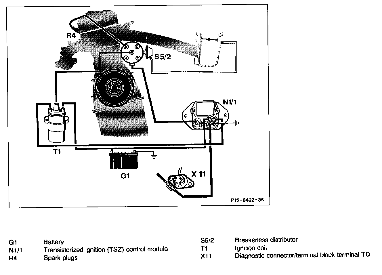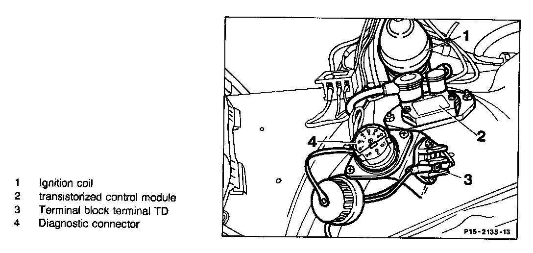 Function of the breakerless transistorized ignition system (TSZ)Only a 4-pin connector is plugged in at the small transistorized control module (distinguishing feature to ignition control module).