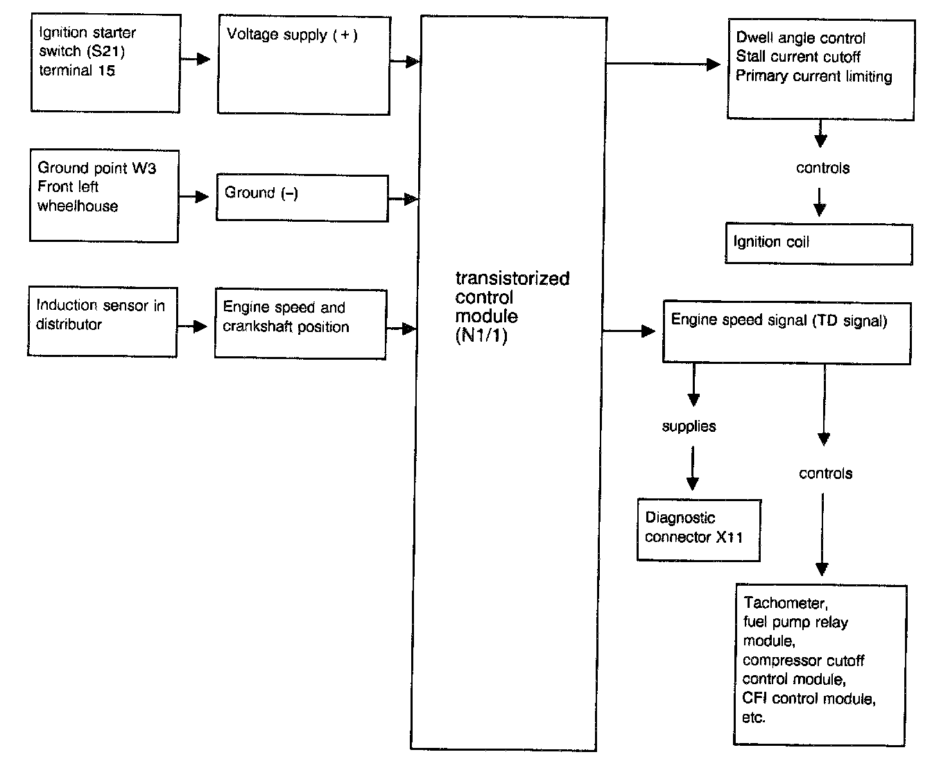 The transistor engine speed (TD) signal is produced in the transistorized control module. This is an engine speed-dependent square-wave signal.