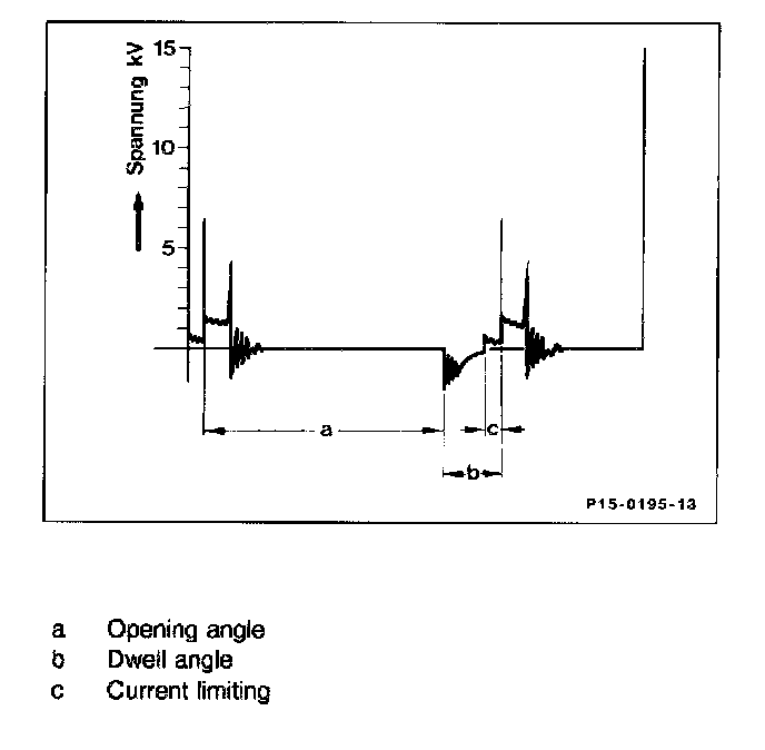 The optimal capacity of the ignition system is achieved by the dwell angle control in the transistorized control module. The dwell angle is controlled within the control range so that the same primary current is always achieved approximately in every operating state, i.e. at different battery voltages and engine speeds.