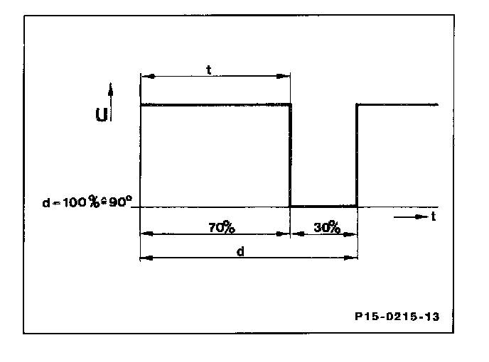 When performing tests, the On time (t, e.g. 70% of the individual square-wave pulses is measured as dwell angle in degrees or as on/off ratio in percent (related to period, d).
