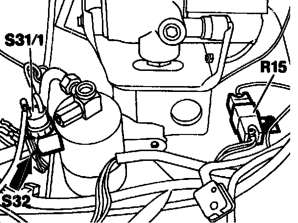 If voltage is present at one connection only, check high pressure of air conditioning system. If pressure is > 3 bar, renew pressure switch (S31/1). If pressure is < 2 bar, top up air conditioning system with approx. 200 g refrigerant (R12), and localize and eliminate any leakage.