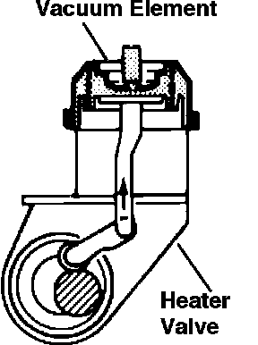 The heater valve opens to allow coolant to flow to the heat exchanger whenever vacuum is not present at the heater valve vacuum element, and closes whenever vacuum is present. The TCC control unit actuates the heater valve via the switchover valves when it determines the need for heat. In some modes the heater valve will be opened continuously and in other modes the control unit will switch it "ON" and "OFF" as necessary, to obtain the desired temperature.