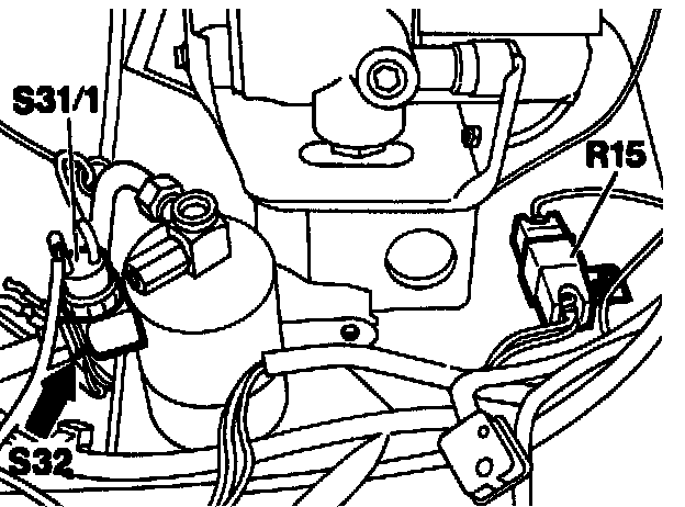 To do this, disconnect one cable at the pressure switch (S31/1), run engine at idle speed (> 750 rpm) and switch on air conditioning system. Clean sight glass (arrow) in receiver dehydrator. Observe sight glass and simultaneously connect cable to pressure switch (S31/1). Refrigerant level must rise shortly after the electromagnetic clutch is switched on and then flow through with no bubbles (i.e. refrigerant no longer visible).