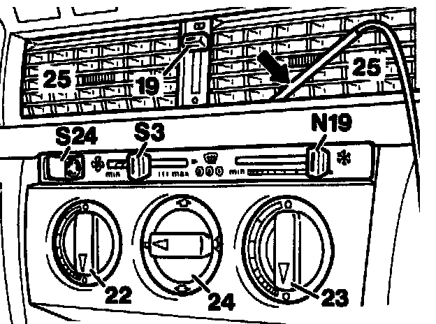13 Check cutout temperature of temperature slide control by moving air volume slide switch to stage 1. Run engine at approx. 2000 rpm. Alter the 3rd cutout of the electromagnetic clutch, the air outlet temperature at the center outlet should not be less than approx. +3 °C; check evaporator temperature sensor if necessary.