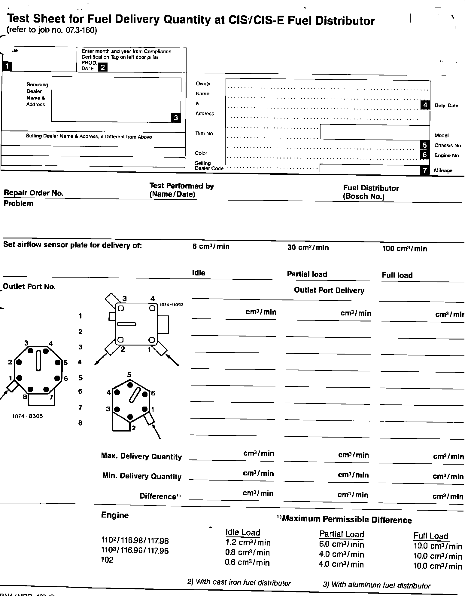 Test Sheet for Fuel Delivery Quantity at CIS/CIS-E Fuel Distributor: