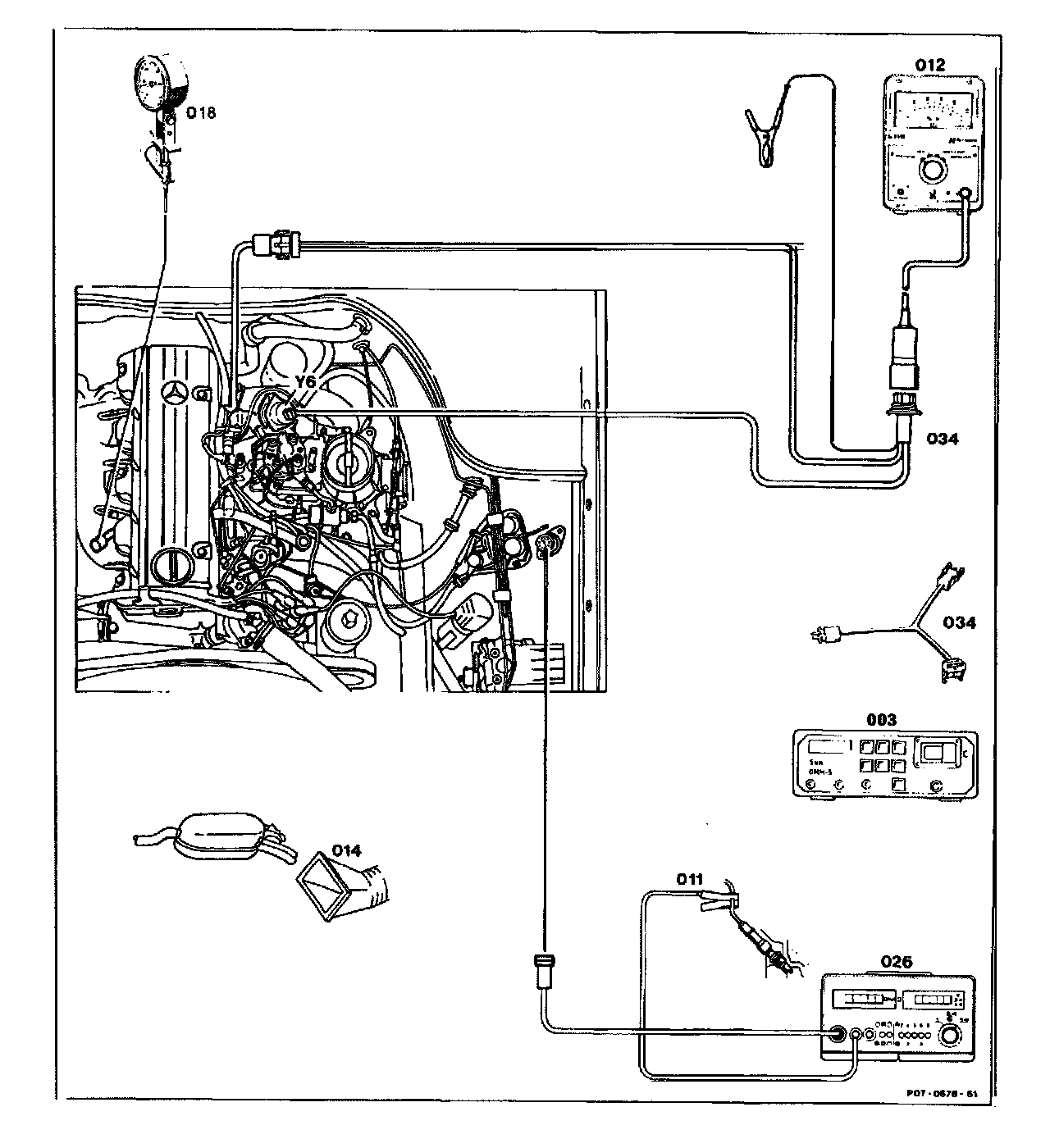 Connect multimeter (003) to idle speed air valve (Y6) via test cable (033)102 589 04 63 00.