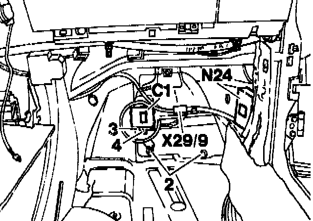 NOTE: In vehicles with airbag 1/3 (recognizable from the inscription 1/3 on the test coupling/plug connection, airbag, 10-pin, X29/9), the reserve power source is removed and the plug connection is isolated.