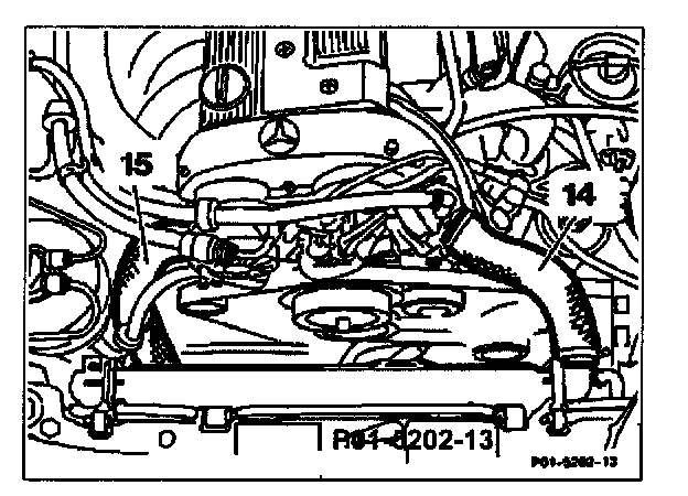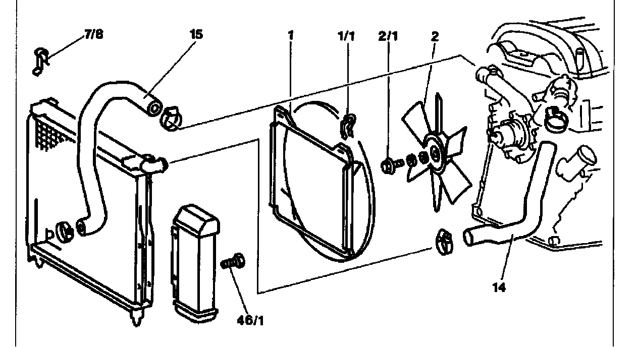3. Detach coolant hoses (14 and 15) at the radiator.