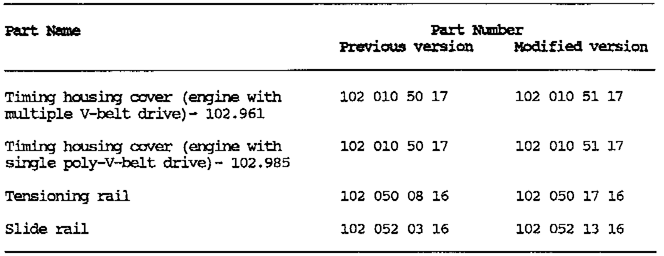 The timing chain housing cover for the single roller timing chain is no longer supplied as a spare part. As replacement the cover for the double roller timing chain must be used. In addition, the corresponding tensioning rail with a wider mounting hole (Fig. 1, L), as well as the wider slide rail must be installed.