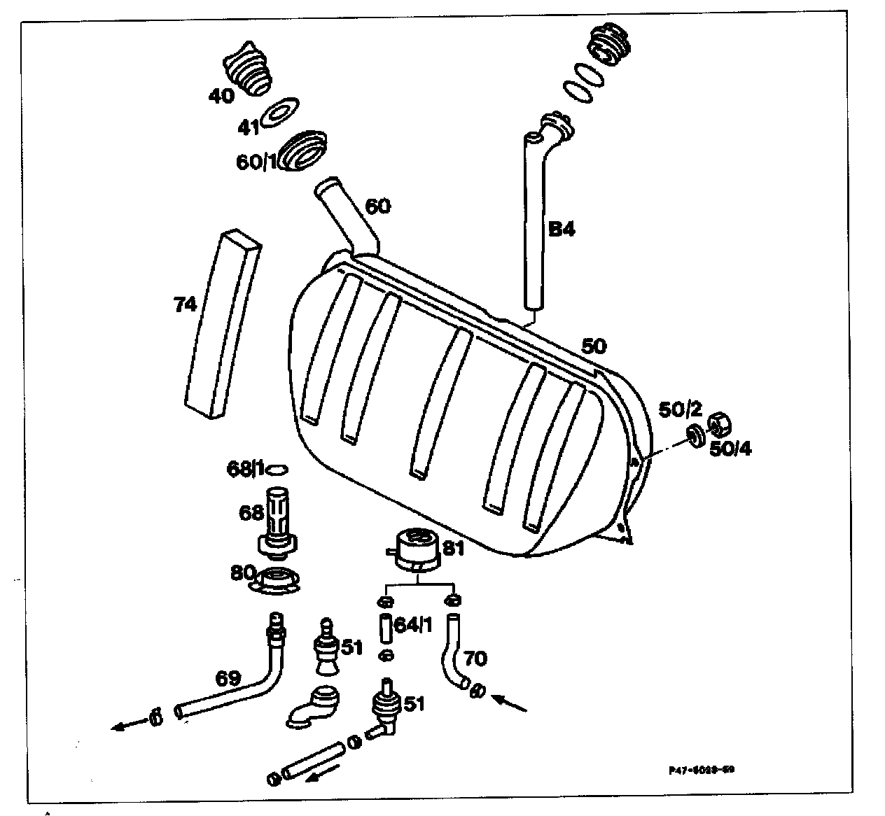 Installation note: Pre-install vent line at fuel tank. Lay line with slight rise and free of kinks. Check that cup seal (64/3) is correctly seated.