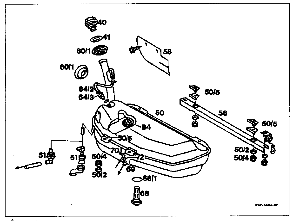 Caution: When removing fuel tank, ensure that the connection fitting for the vent line (64/2, at the filler neck) does not catch on a line. Push exhaust pipe and level line to the left.