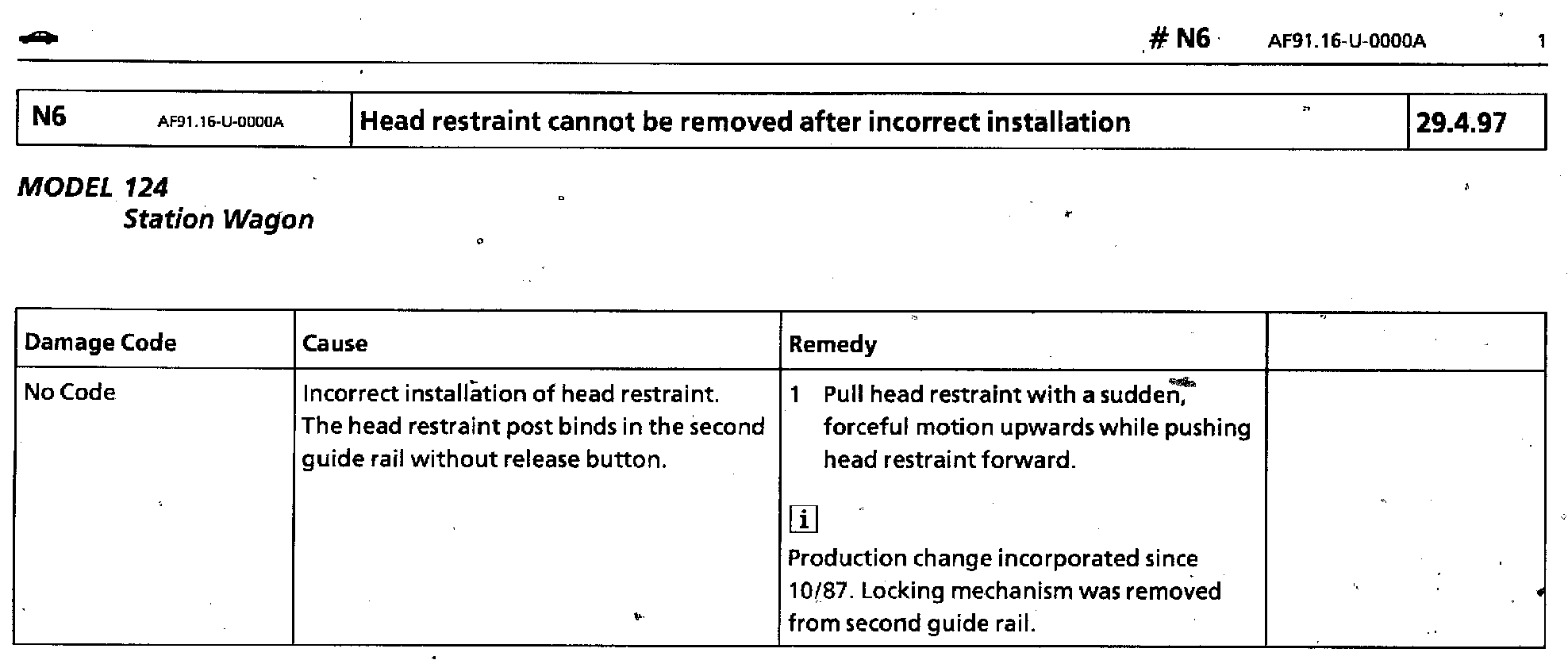 Unable to Remove Head Restraint, Incorrect Installation