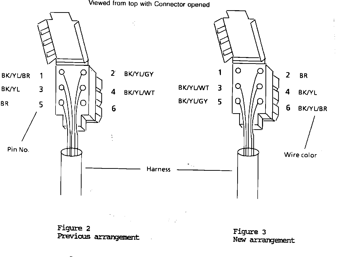 As of July (A) and Octcber (F) 1985 production the wire/pin arrangement of the windshield wiper motor-to-harness connector has changed.Effective Serial Number