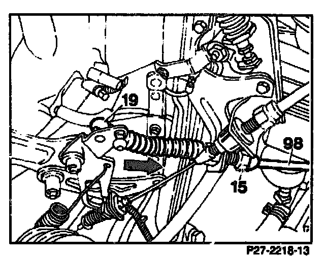 Detach control pressure cable. Push back ball socket (19) (direction of arrow), then pull forward again until a slight resistance is felt. It should now be possible to press the ball socket (19) onto the ball head free of tension; re-position adjusting screw (15), if necessary