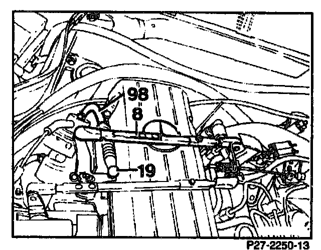 Press off ball socket (19). Pull idle travel rod apart (8) as far as the stop, pull control pressure cable forward until a slight resistance is felt. In this position, hold ball socket above the ball head and attach free of tension; it may be necessary to re-set idle travel rod (8).