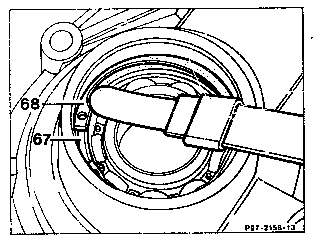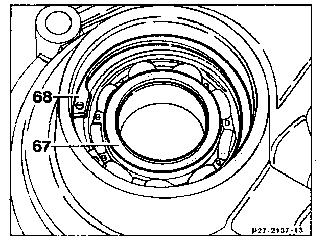 There must not be any play between locking ring (68) and grooved ball bearing (67). Locking rings are available in three thicknesses (2.0 - 2.1 - 2.2 mm). When inserting the locking ring, ensure that it is properly located in the groove. It it is not possible to insert the locking ring, a thinner locking ring must be used. If there is any play between locking ring and grooved ball bearing. a thicker locking ring must be inserted. Check with a feeler gauge (0.1 mm) whether any play exists.
