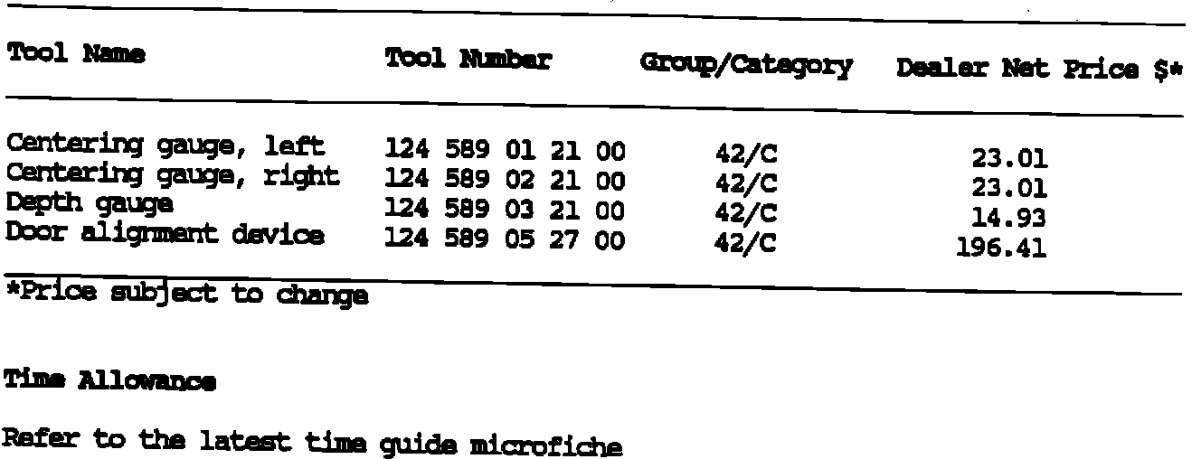 2. Loosen the door hinge bolts, or if the hinge is welded, as is the case with the rear door, use door alignment device 124 589 05 27, and properly align the door (see service microfiche Body, Assembly Jobs 1, Model 201, Job Nos. 72-050 and 72-060).