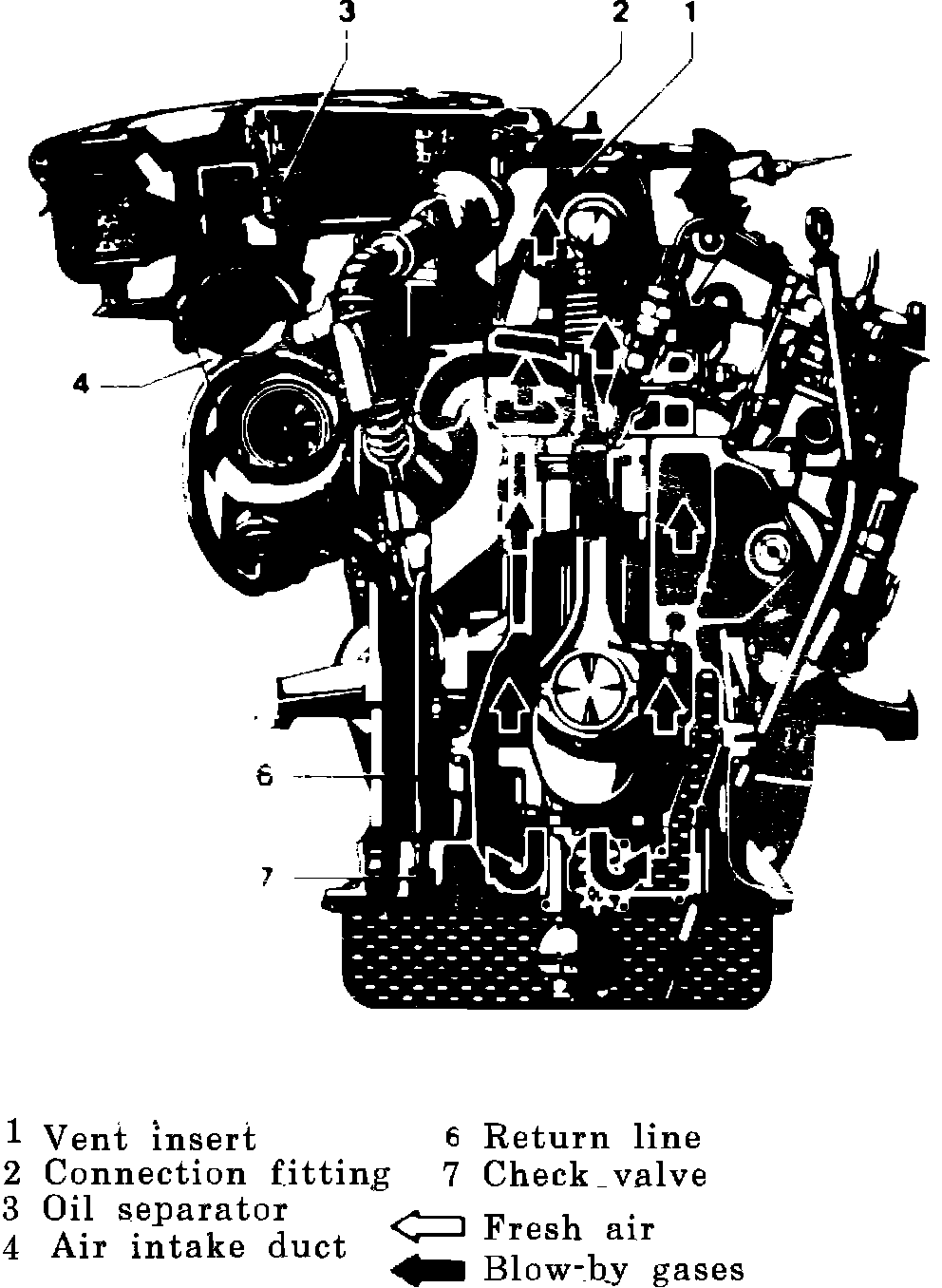 The engine blow-by gasses and crankcase vapors flow across the vent insert, Fig. 6, and connection fitting to the cyclone oil separator. They then flow through the air intake system and into the combustion chambers together with the intake air.