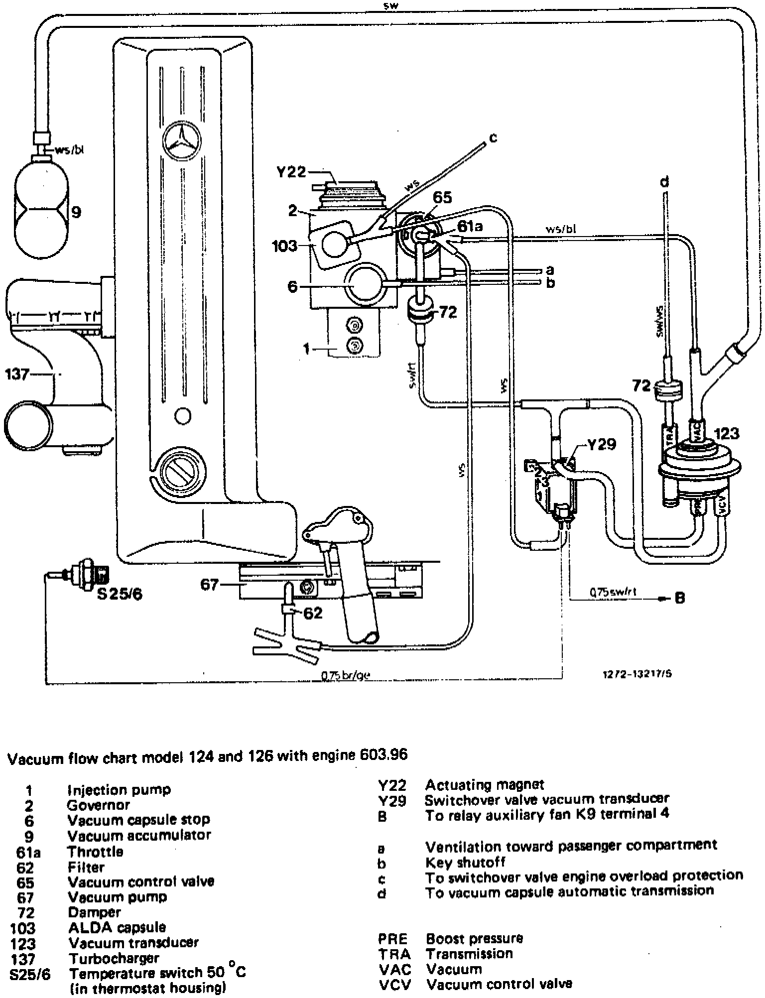 The switchover valve (Y 29) is connected to ground via temperature switch (S25/6) for connection 2-3. The vacuum controlled by the vacuum control valve rests against connections (PRE and VCV) and acts directly against the vacuum at connection (VAC). This will result in the vacuum at connection (TRA) required for transmission control.