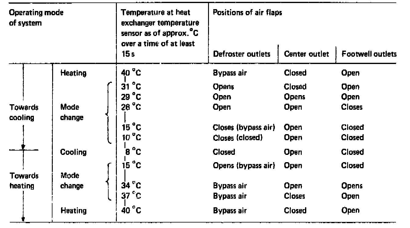 The modes are changed by switching the air flaps at the transition from heating to cooling and from cooling to heating. Several air flaps open and the transition becomes less noticeable. The air flaps are controlled as described in the table overleaf.