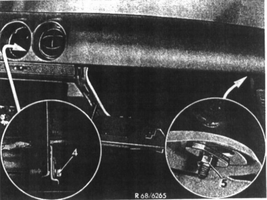 28. Push panel forward for accurate connection of defroster nozzles to heater box, while inserting the center screw (4) into holder.