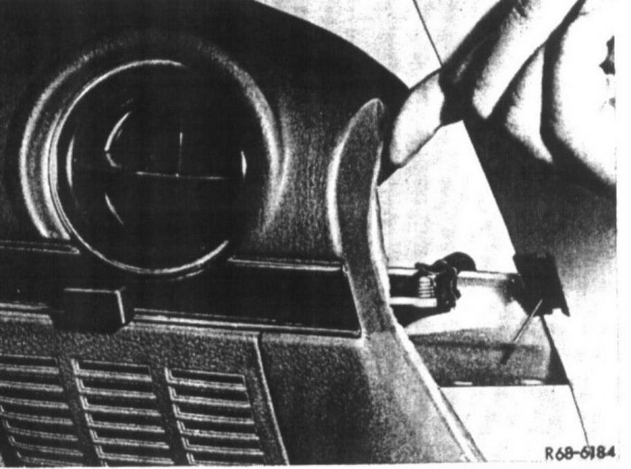 26. Lift panel at bottom center over controls against cross member, while simultaneously bending the righthand edge down and placing the panel with the defroster nozzles on the heater.